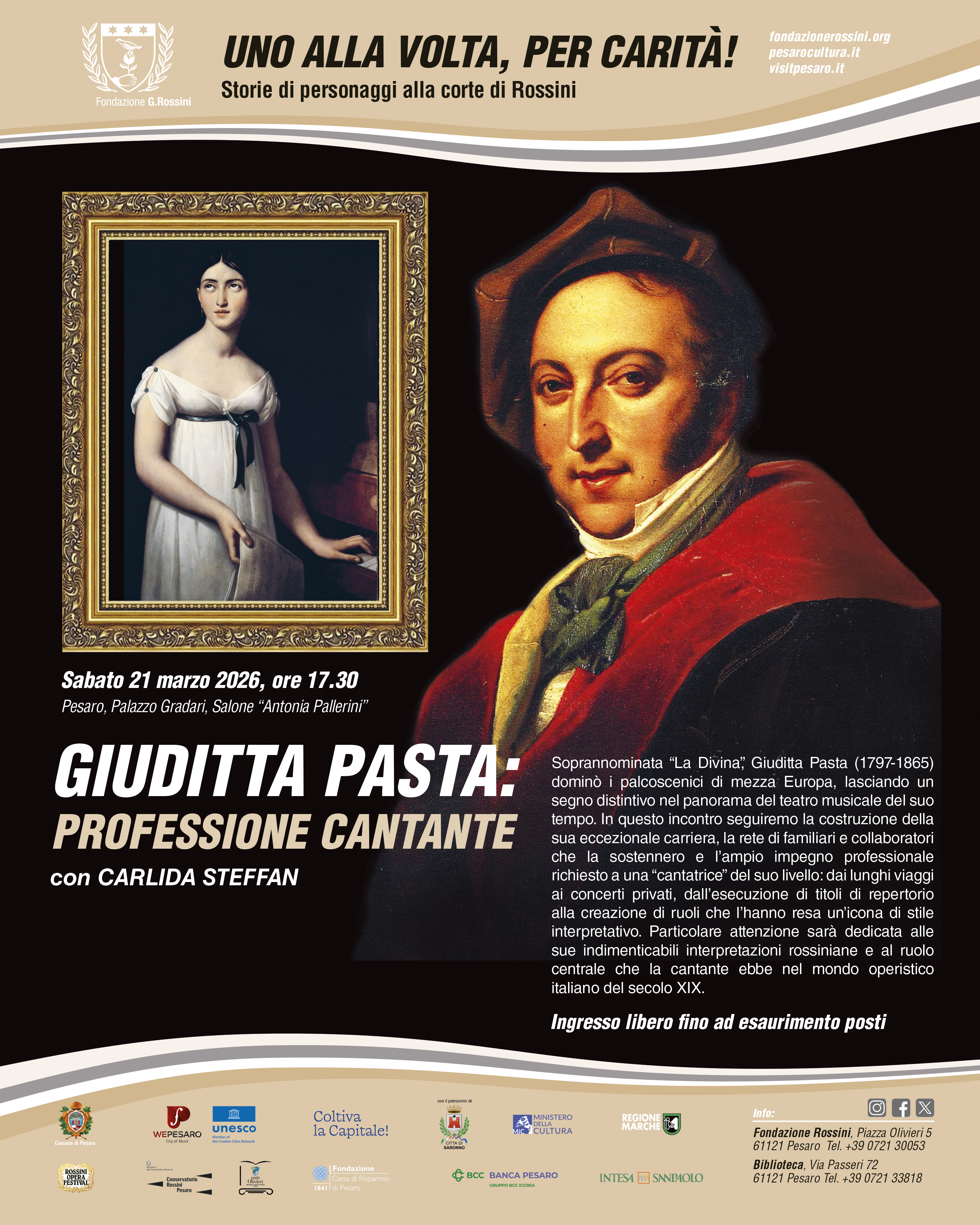 L’iniziativa è promossa dalla Fondazione Rossini con il patrocinio dei Comuni di Pesaro e Saronno, nell’ambito di una collaborazione culturale che valorizza la figura della grande cantante saronnese nel contesto della storia della musica e del teatro musicale europeo.